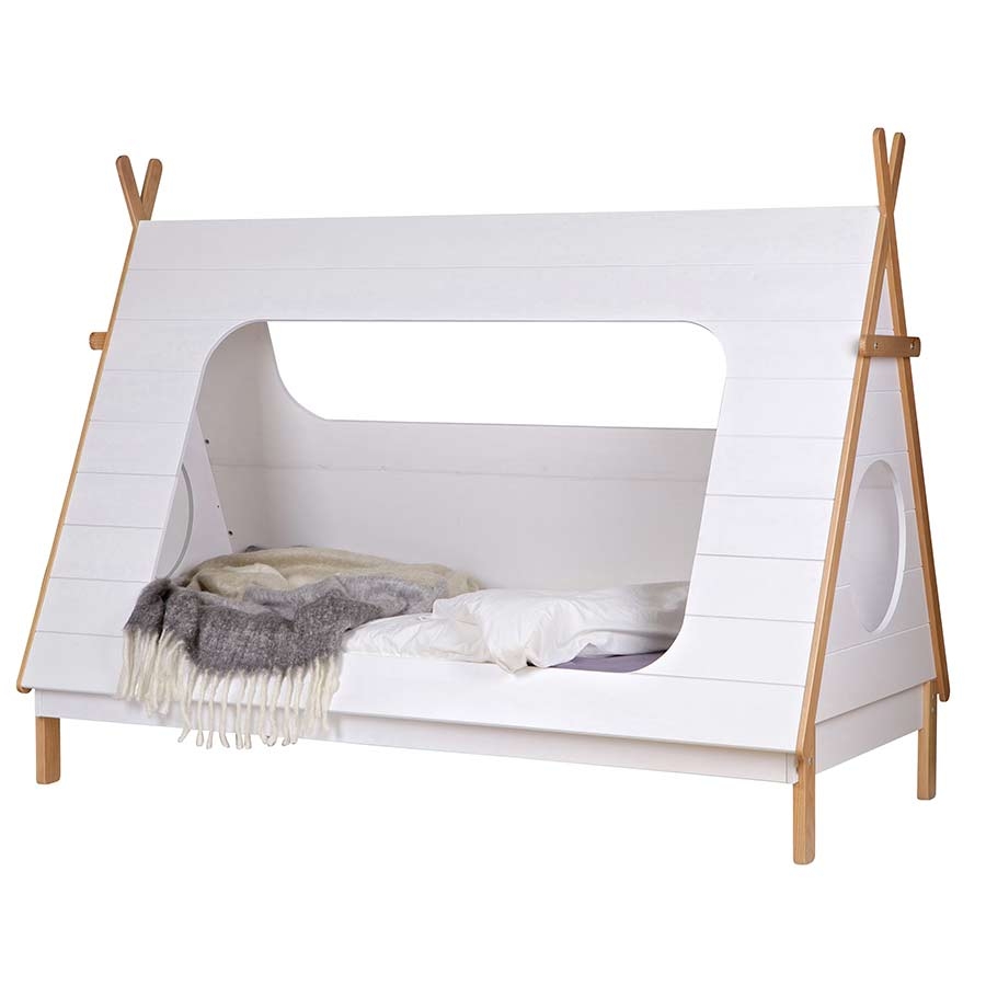 Willkommen im Indianerreich! Das stylishe Tipi Bett von Woood setzt trendige Akzente im Mädchen- und Jungenzimmer. Das Spielbett mit Hausdach in Zeltoptik schafft ein tolles Ambiente für kleine Abenteurer und lädt zum Kuscheln, Spielen und Entdecken ein. Durch die naturfarbenen Holzstäbe erhält das weiße Kinderbett das gewisse Etwas. Wahlweise erhalten Sie das Kinderbett Tipi zusammen mit der geräumigen Bettschublade, die Platz für Wäsche, Decken und Kissen bietet. Passend zum Tipi Bett finden Sie in unserem Shop das coole Regal im Indianerdesign.